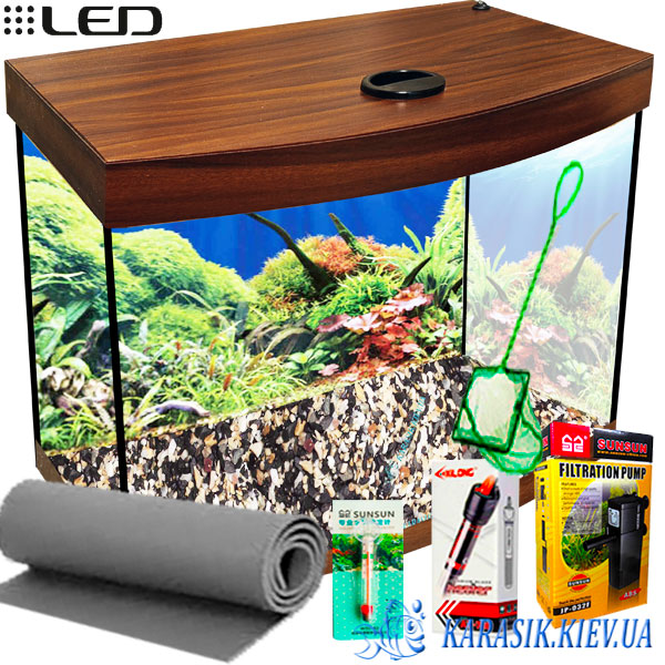 Аквариумный комплект Орех – аквариум высокого качества с выпуклым передним стеклом на 30 литров — это довольно изысканный и красивый аквариум. Размер такого аквариумного комплекта (ширина - 40 см. длина - 25 см. и высота - 34 см.) Этот аквариумный комплект подойдет для начинающих аквариумистов, в нем собрано все что необходимо для начала запуска и обслуживания аквариума. Аквариум с текстурой ореха очень гармонично впишется в Ваш интерьер. В аквариумной крышке уже предусмотрено отсек для кормления аквариумных обитателей, а также в задней части крышки имеются специально техническое отверстие для подключения аквариумного оборудования.