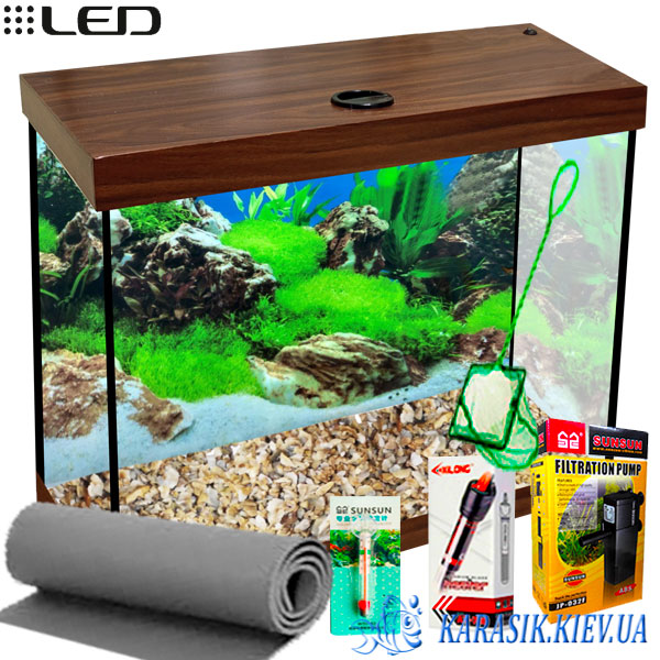 Аквариумный комплект  Орех – аквариумный комплект приямоугольной формы ысокого качества  на 35 литров — это довольно изысканный и красивый аквариум.  Размер такого аквариумного комплекта (ширина - 40см. длина - 25 см. и высота - 39 см.) Этот аквариумный комплект подойдет для начинающих аквариумистов, в нем собрано все что необходимо для начала запуска и обслуживания аквариума. Аквариум с текстурой ореха очень гармонично впишется в Ваш интерьер. В аквариумной крышке уже предусмотрено отсек для кормления аквариумных обитателей, а также в задней части крышки имеются специально техническое отверстие для подключения аквариумного оборудования. В данной крышке встроенная LED светильник
